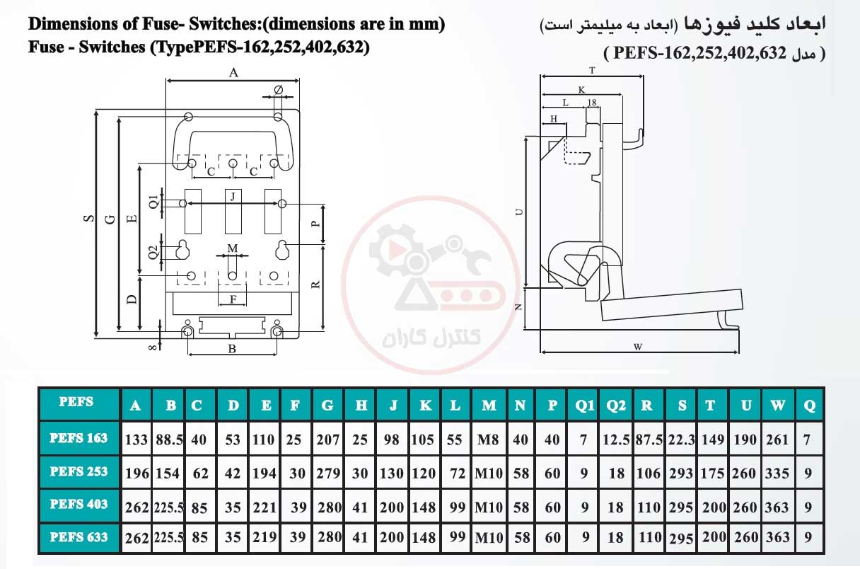 کلید فیوز PEFS-632 یکی از کلیدفیوزهای سری PEFS-632 تولیدی شرکت پیچاز است که بر اساس استانداردهای بین المللی IEC60947,VDE0660 طراحی و تولید شده است. این کلید ها با مواد پلیمری الیاف دار که داری خاصیت خود خاموش شوندگی و با تحمل حرارتی بالاست تولید شده است. یکی از مهم ترین ویژگی های کلیدهای سری PEFS، ایمنی بالا و حفاظت مناسب در زمان تعویض فیوز از طریق جداسازی اجباری درب از بدنه اصلی فیوز می باشد. کلید فیوز PEFS-632 دارای اسکلت بندی قوی و مناسب جهت کاربردهای صنعتی می باشد. در سری کلید فیوزهای PEFS با تغییر و بهینه سازی کنتاکت ها به منظور تامین اتصال بهتر و با دوام تر تیغه فیوزها در حالت وصل، توجه ویژه ای شده است. جنس کنتاکت های ورودی و خروجی این کلیدها از مس الکترولیت با آبکاری نقره جهت دوام بیشتر می باشد. ولتاژ نامی این کلید در جریانهای متناوب (AC) 660 ولت است. میزان تحمل ولتاژ ضربه (Uimp) 6 کیلوولت میباشد. سایز فیوز مناسب جهت استفاده در این کلید فیوز سایز (3) میباشد که تلفات قدرت در این فیوزها 48 وات میباشد. این کلید فیوز با درجه حفاظت IP20 بوده و وزن بدون فیوز آن 5.6 کیلو گرم میباشد.