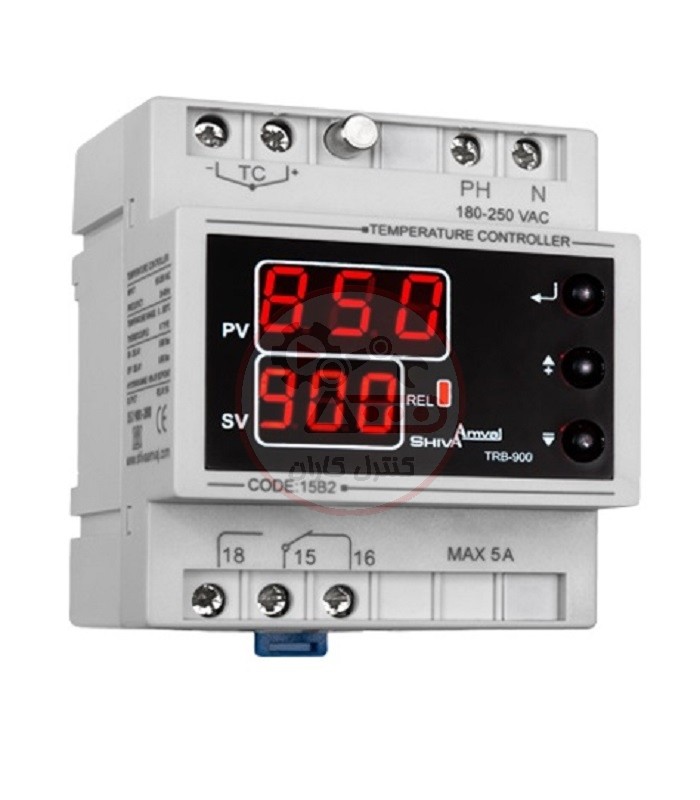 ترموستات 0 تا 900 درجه شیوا امواج مدل TRB-900 با کد 15B2 دارای ولتاژ تغذیه 250-180 ولت AC میباشد. این ترموستات دستگاهی مناسب برای کنترل دما در محدوده صفر درجه سانتیگراد تا 900 درجه سانتیگراد با دقت 1 درجه سانتیگراد میباشد. ترموستات 0 تا 900 درجه شیوا امواج با سیستم میکروپروسسوری و با استفاده از ترموکوپل نوع K، قابلیت نمایش و کنترل دما را دارد.