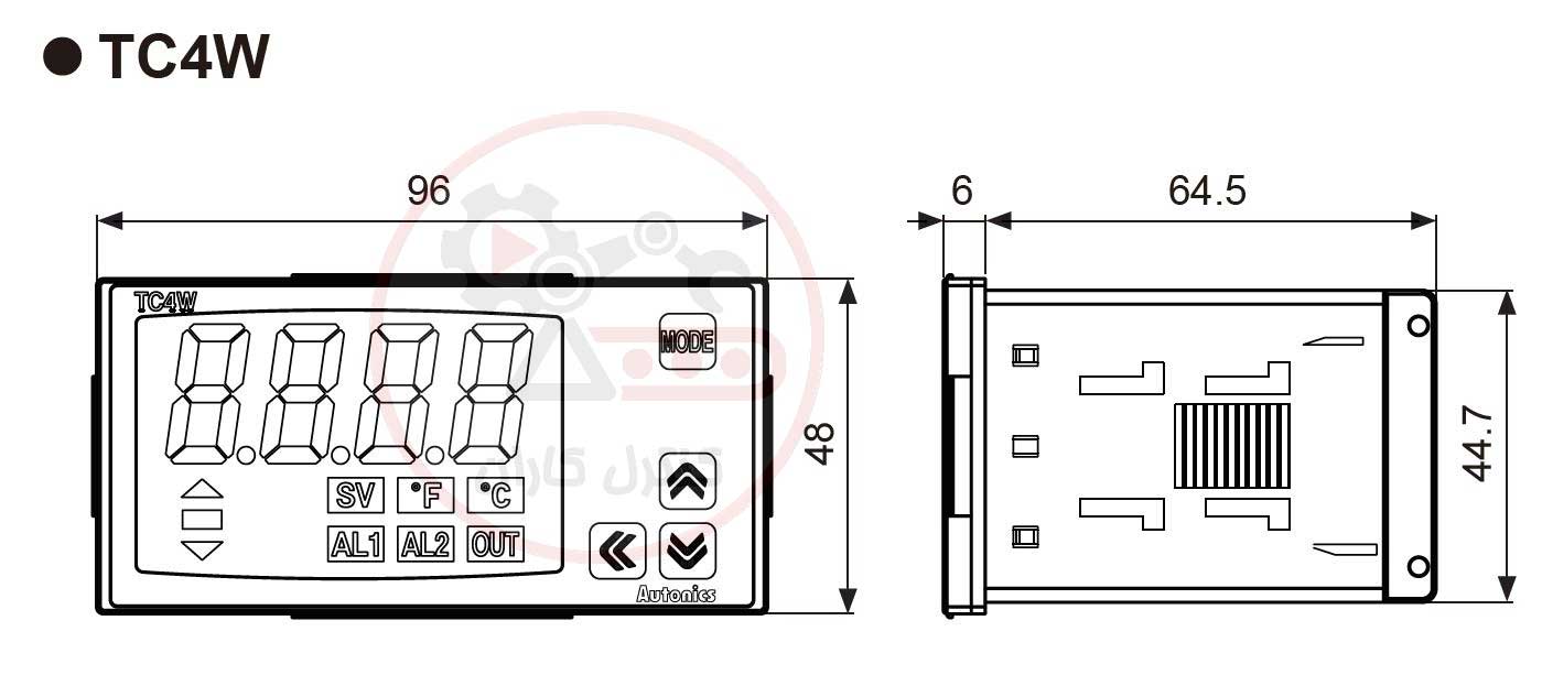ابعاد ترموستات جهت برش نصب روی تابلو و یا تعویض آن بسیار حائز اهمیت میباشد. ابعاد ترموستات TC4W-12R در زیر آمده است.